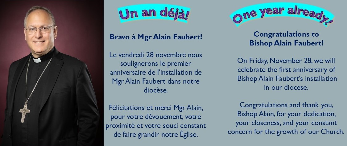 Seigneur, nous te prions d'une façon spéciale pour notre évêque Mgr Alain Faubert, à l'occasion du premier anniversaire de son installation comme pasteur de notre diocèse. Que l'Esprit Saint continue de l'accompagner et le guider dans son ministère.