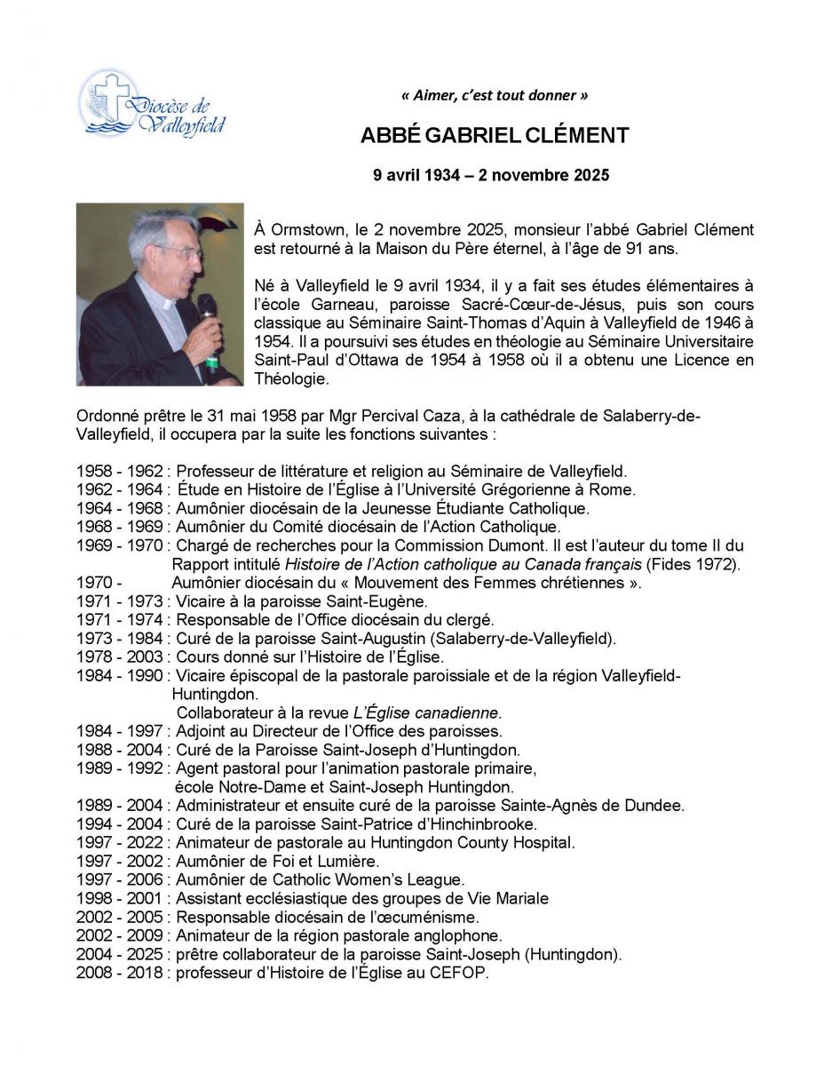 Avis de décès - Monsieur l'abbé Gabriel Clément