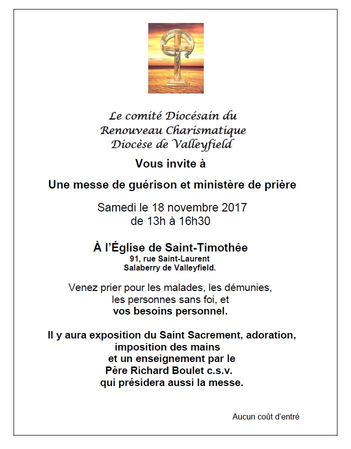 Le Mouvement du Renouveau Charismatique du diocèse de Valleyfield organise une messe de guérison à l'église Saint- Timothée le 18 novembre 2017 à 13 h.
