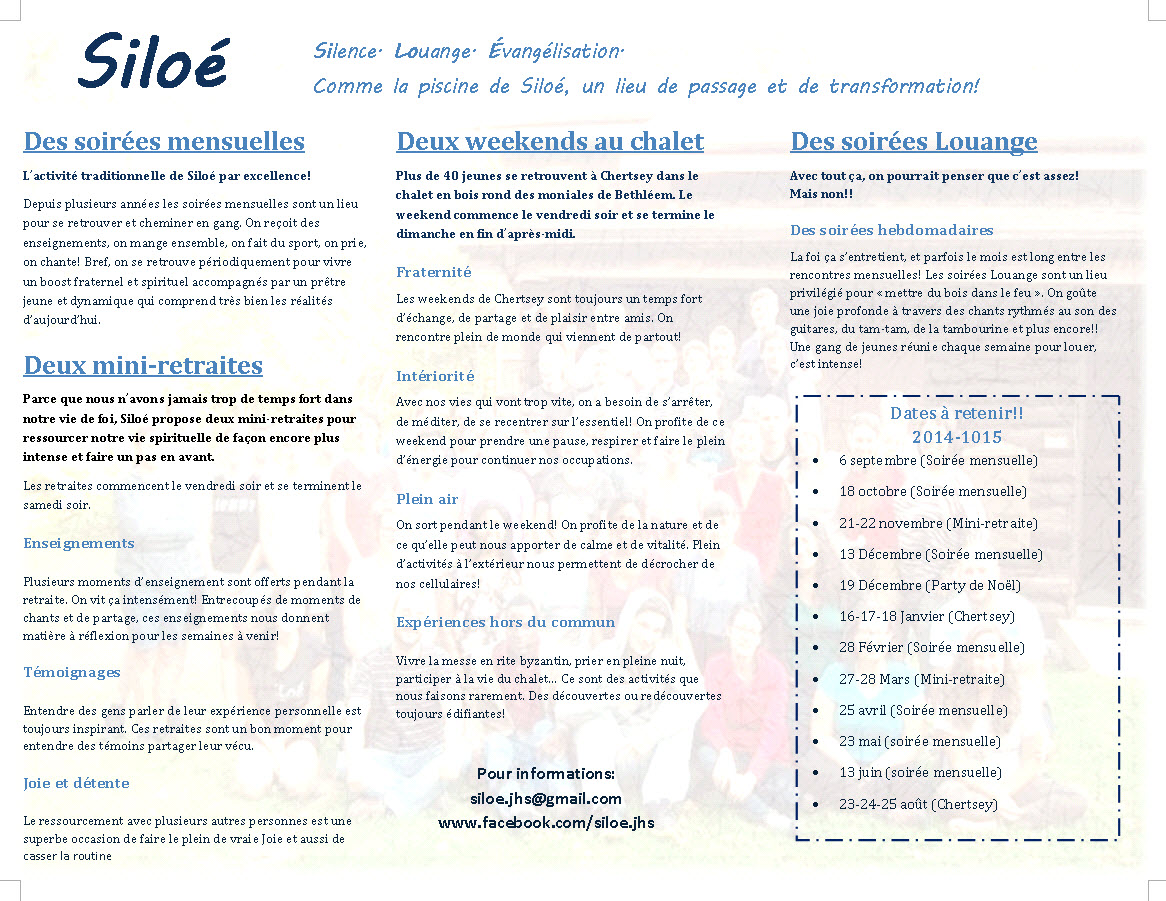 Samedi, 25 avril, 2015 - 19:00 Le samedi 25 avril 2015, soirée mensuelle de Siloé SILOÉ: dépliant 2014-2015