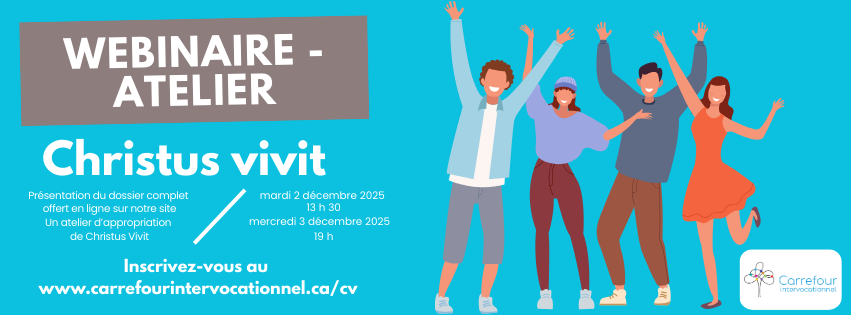 Le Carrefour intervocationnel vous invite à un webinaire-atelier qui s’adresse à tous celles et ceux qui veulent en savoir plus sur Christus vivit, l’Exhortation apostolique du pape François sur la pastorale vocationnelle sur les jeunes.